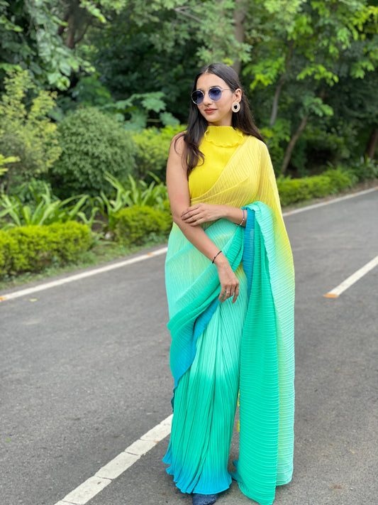 #MBA1909 Yellow ombre pleated 1 min saree and blouse