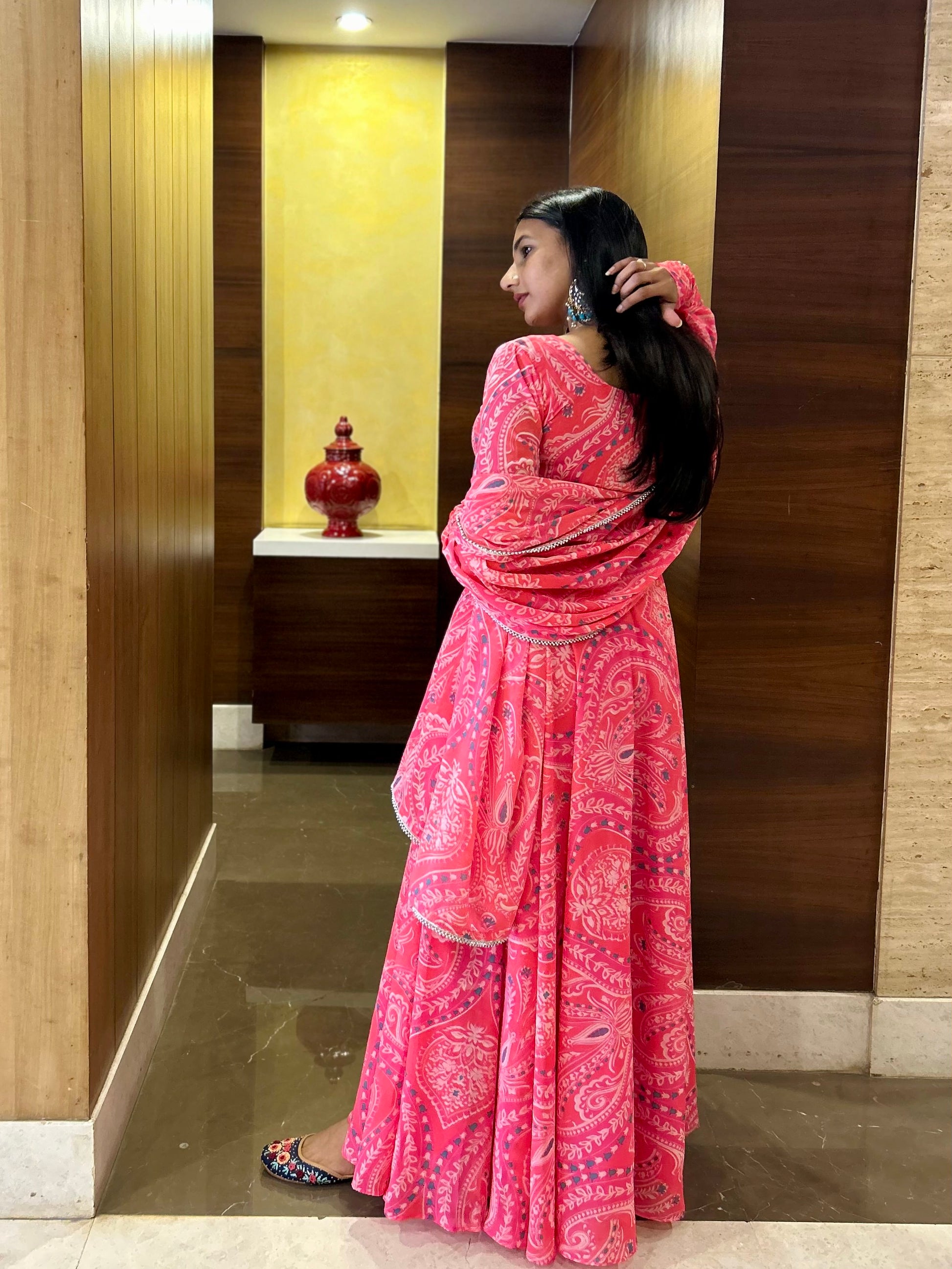 Embrace timeless elegance with our floral chiffon Anarkali, designed to make a graceful statement at any special occasion. Crafted from soft chiffon fabric, this Anarkali gown offers a soft, fluid drape that flatters every body type. Its simple yet sophisticated design features a sleek, figure-enhancing silhouette with a flowing A-line shape that moves beautifully with every step.