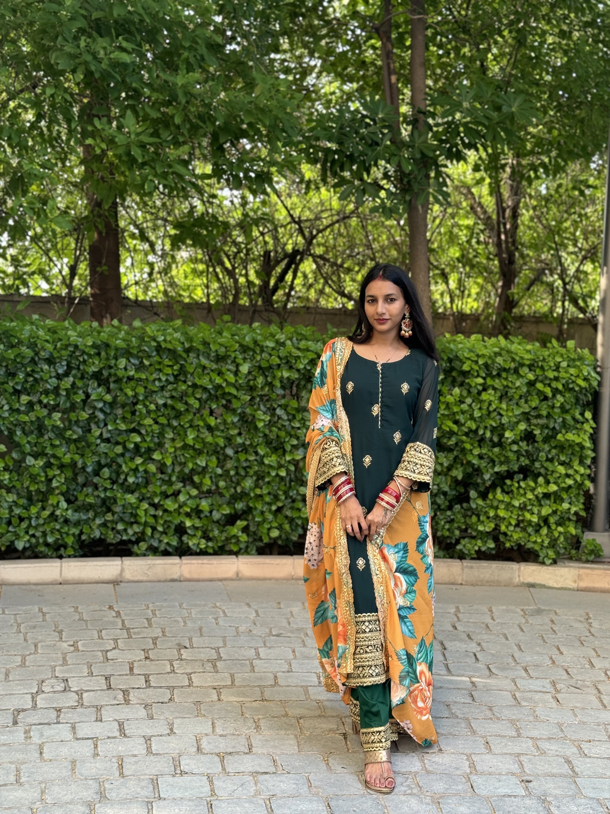 - Design: Intricate sari border detailing on the suit, with a matching organza dupatta for an added layer of elegance.