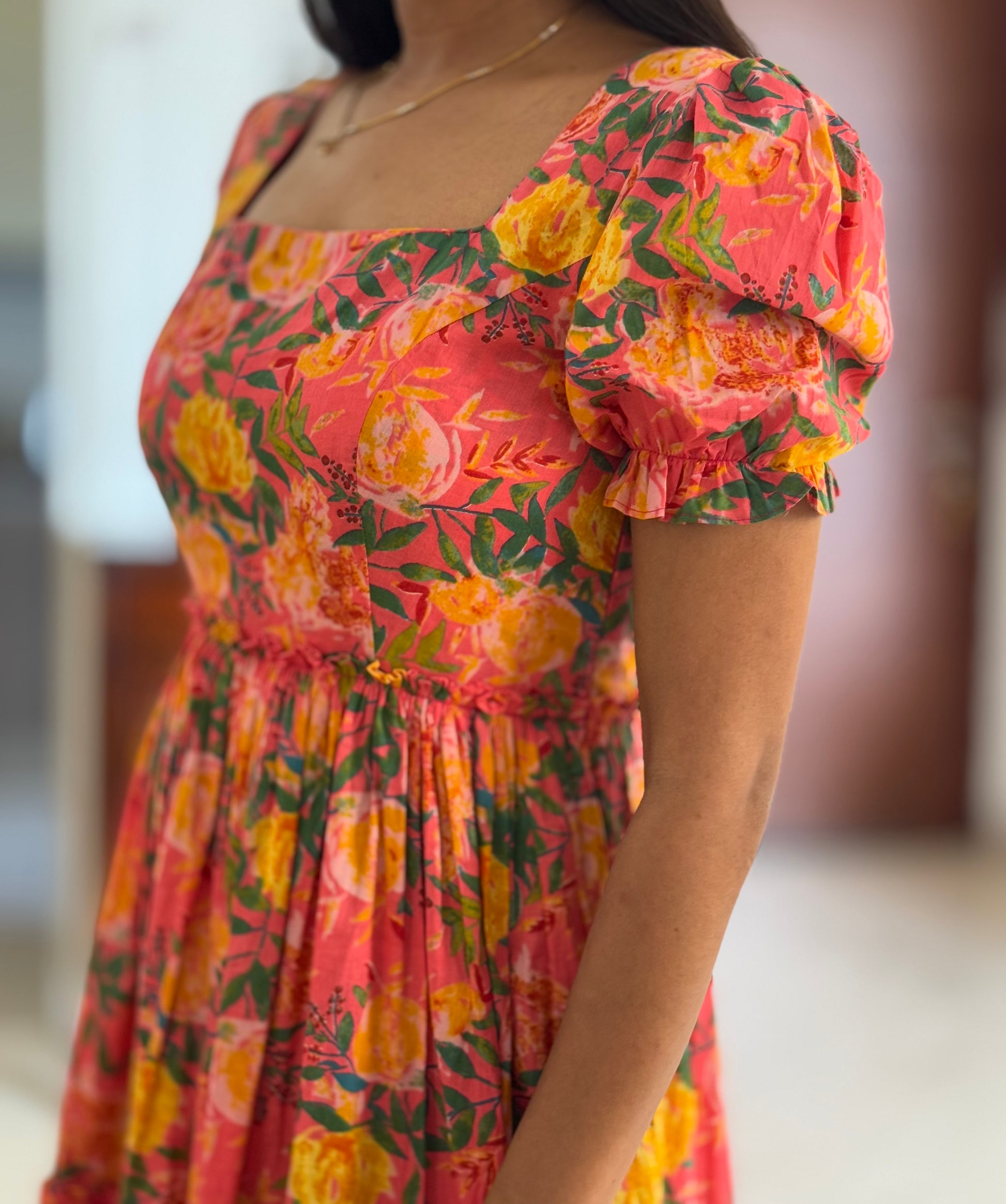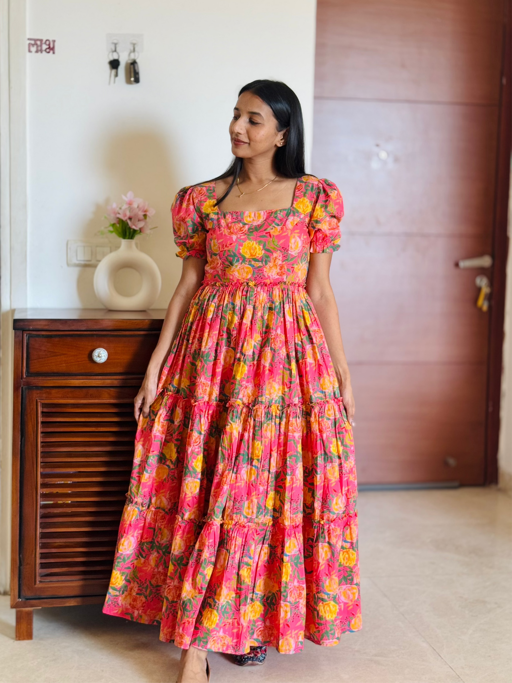 Step into effortless elegance with our Pink floral Cotton Tier Dress – a breezy, beautiful must-have for your everyday wardrobe. Crafted from soft, breathable cotton, this dress features a flattering A-line silhouette with gentle tiers that add flow and movement. The subtle gathers at each tier create a dreamy, feminine drape that’s equal parts chic and comfortable.