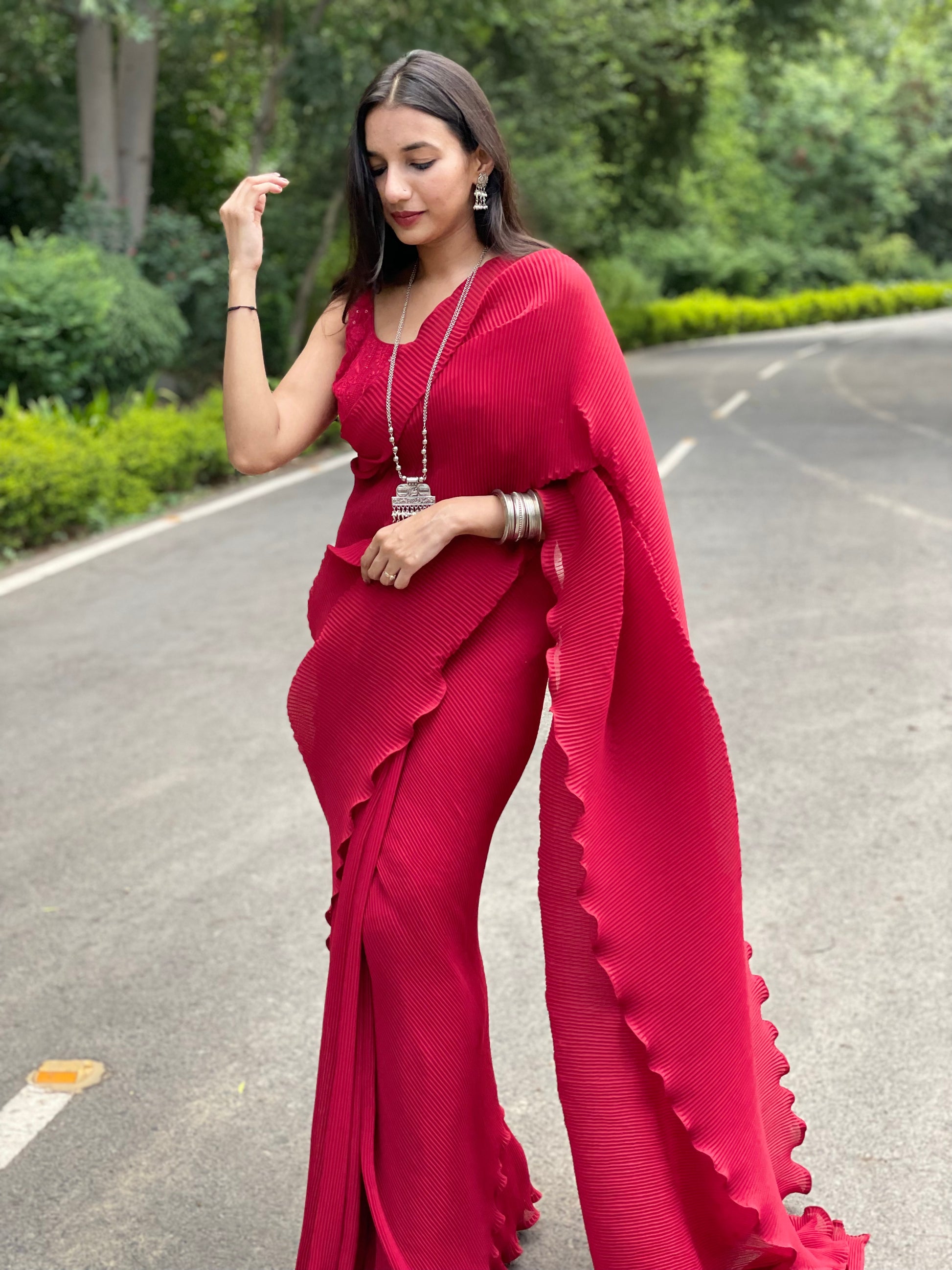 #MBA1981 Cherry Maroon pleated 1 min saree and chikankari blouse
