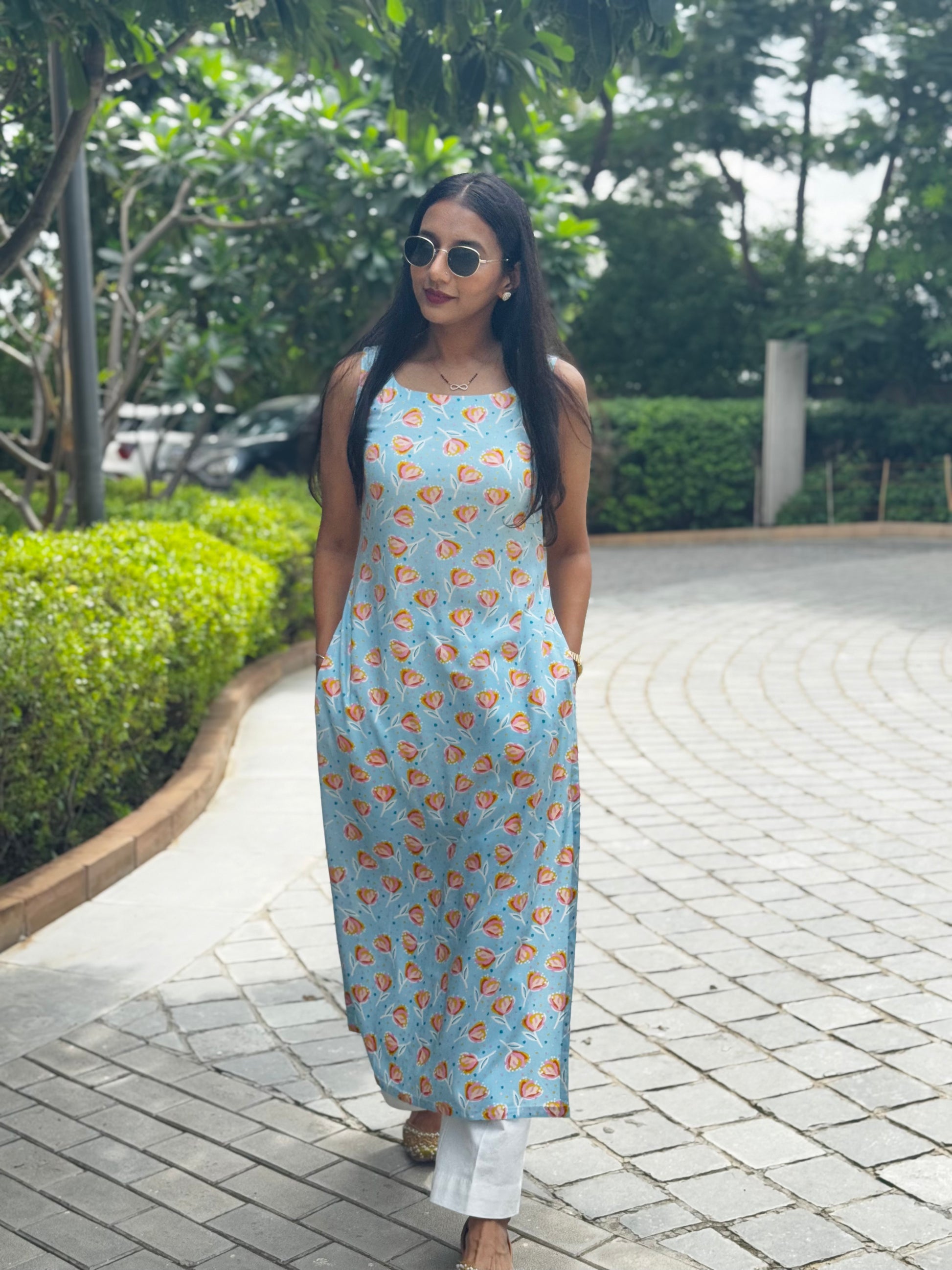 This floral straight kurta is crafted in a lightweight rayon cotton fabric for all-day comfort. Designed with a subtle charm, it features a soft back cut—not quite backless—with a delicate tie-up knot that cinches at the waist to create a flattering silhouette. Perfect for those who love easy grace with a touch of statement, this kurta is ideal for brunches, daytime outings, or simply feeling beautiful at home.