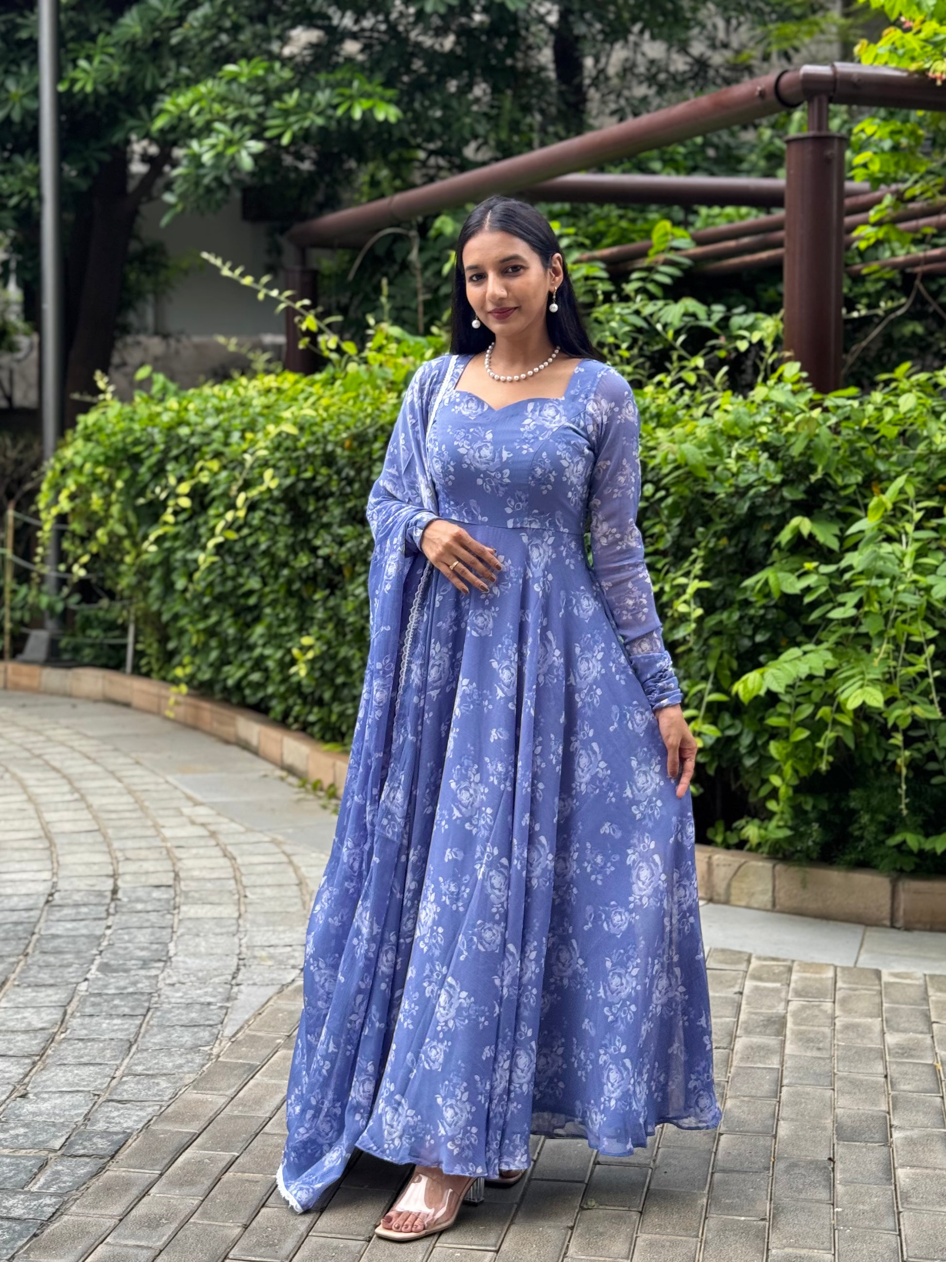 Made with soft chiffon fabric, this anarkali and dupatta will give you a comfortable feel. Its flared pattern and full gathered sleeves create a beautifully flowing silhouette. It also comes with a pure cotton lining for added comfort.