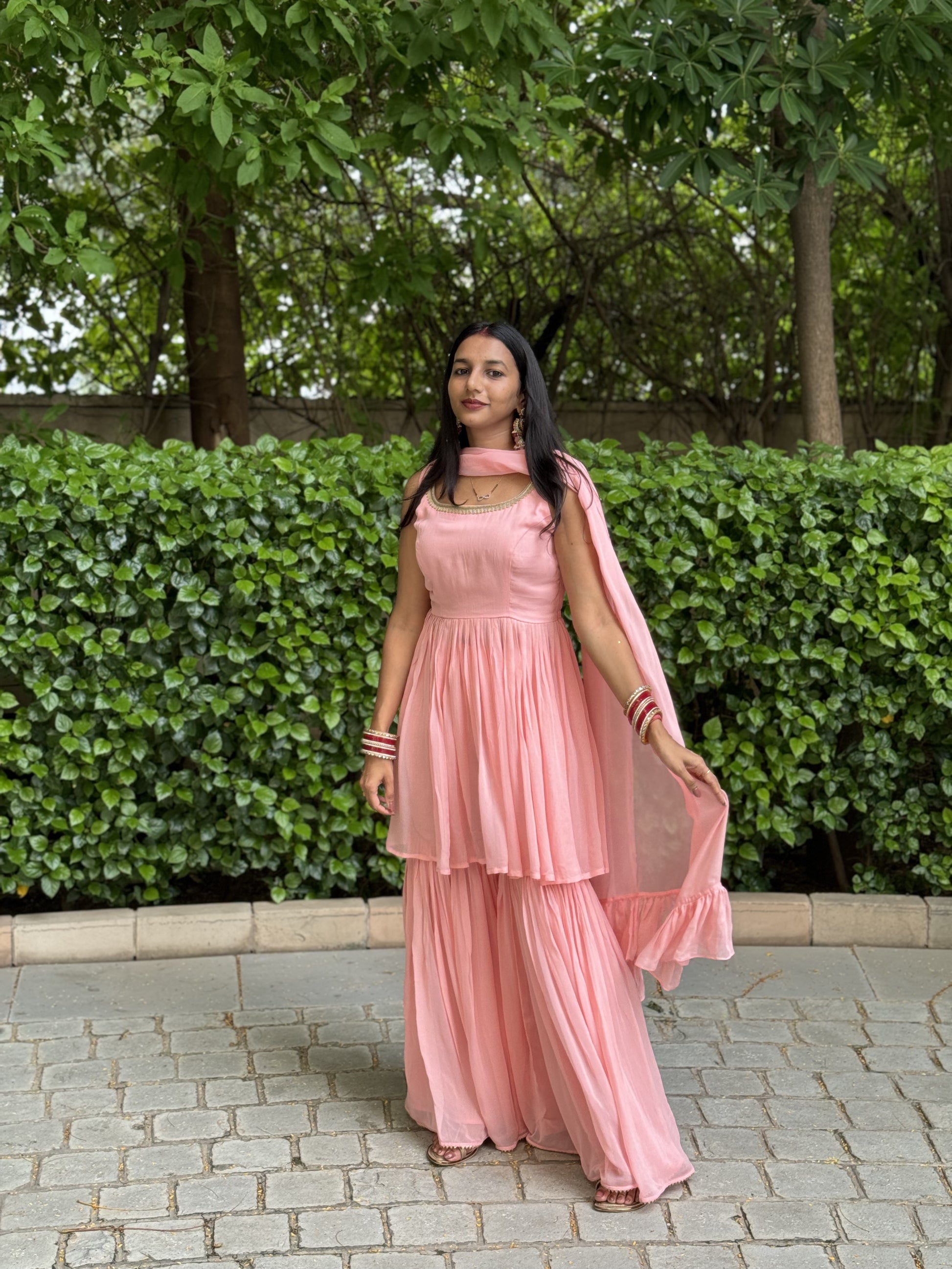 Step into elegance with our handcrafted Pure Georgette Gharara Set—a timeless ensemble designed for festive soirées, family celebrations, and intimate weddings.