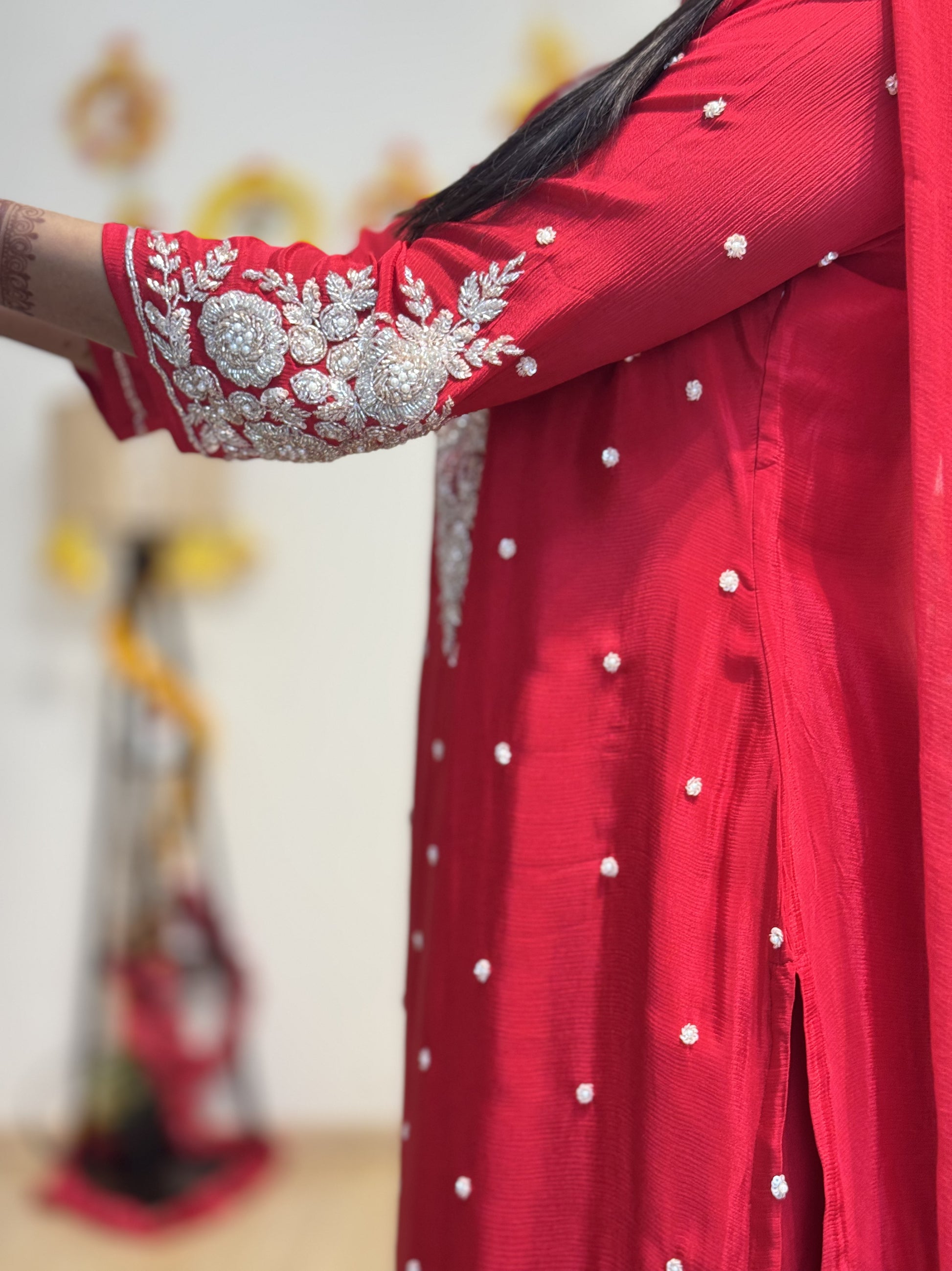 Crafted in pure Chinon fabric, this timeless red kurta and palazzo set is a celebration of grace and tradition. The kurta is adorned with intricate cut dana hand embroidery, shimmering subtly with every movement. Paired with coordinated palazzos and a lightweight chiffon dupatta, delicately embroidered along the borders, this ensemble strikes the perfect balance between elegance and comfort.