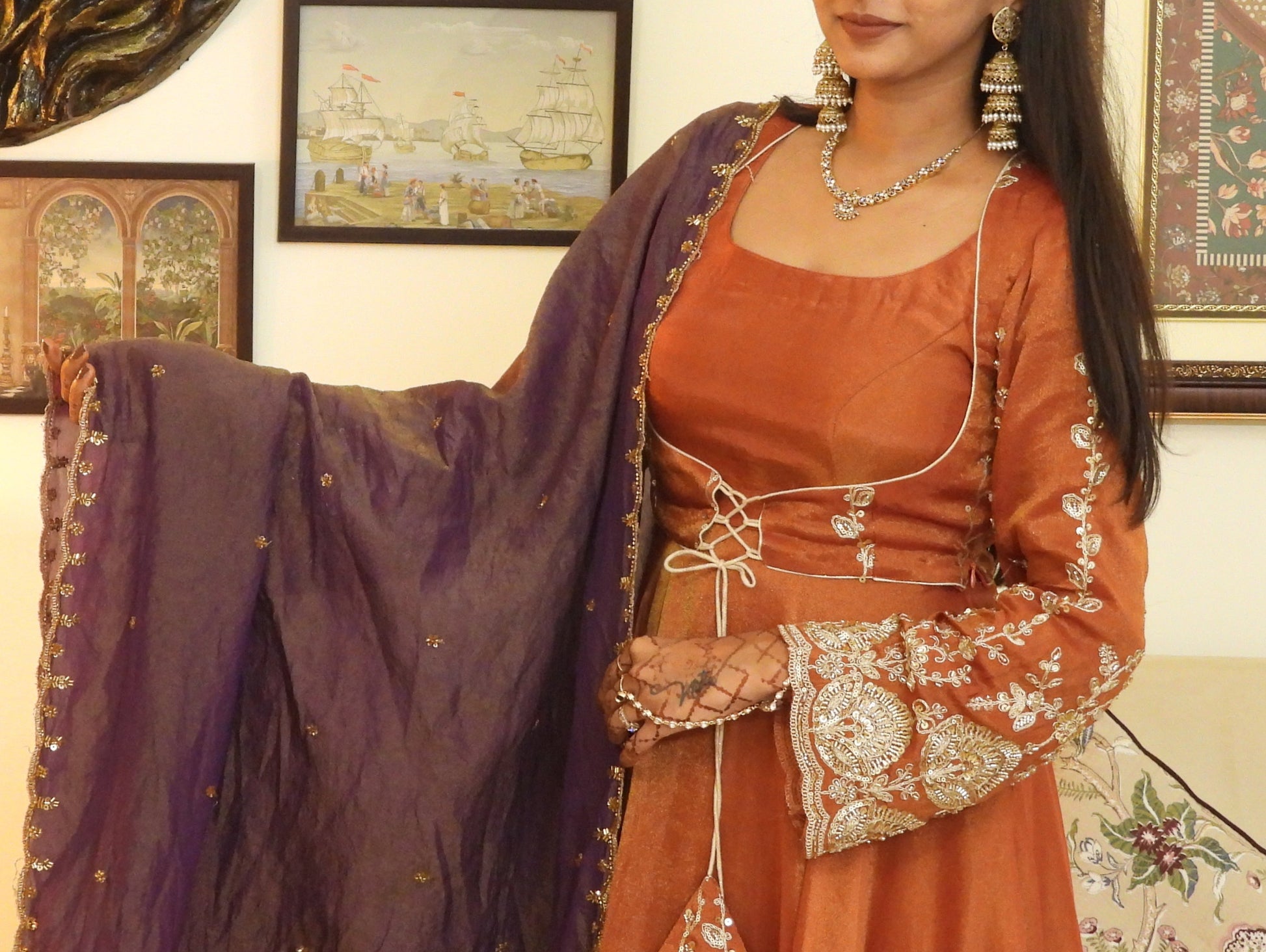 An exquisite rust-hued pure tissue silk Anarkali, paired with a statement jacket and a matching dupatta. The natural sheen of tissue silk enhances its regal charm, making it perfect for festive and wedding occasions. A timeless silhouette reimagined in rich elegance.