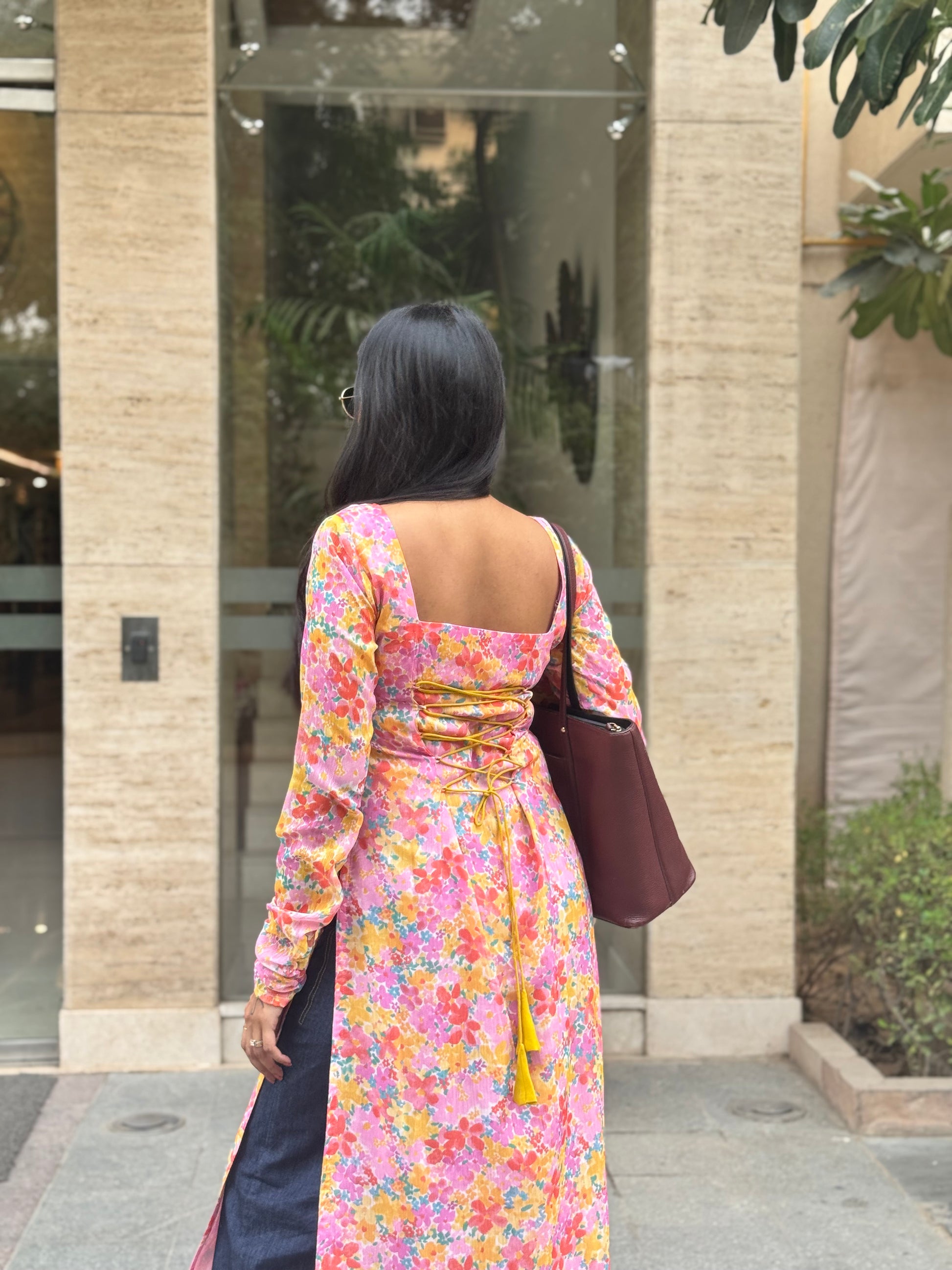Meet the kurti that feels as good as it looks. Crafted in soft, fine georgette with a breathable cotton lining, it falls beautifully without feeling heavy. The churidaar sleeves keep the look classic, while the criss-cross back gives it a subtle modern twist — making it perfect for college, office, brunches, or an easy casual day out