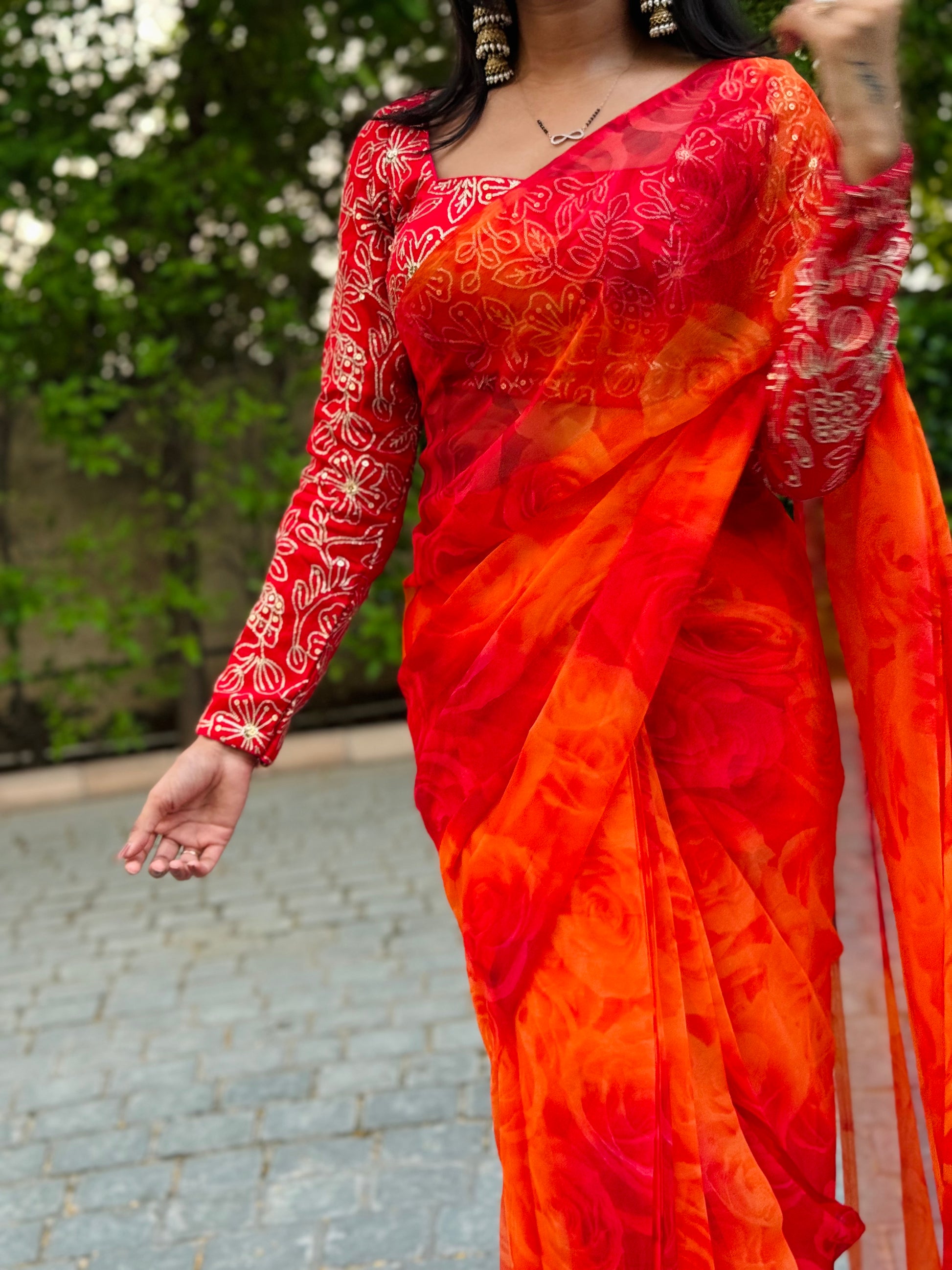 The Gulaabo 1-Minute Saree and Blouse is an effortlessly elegant ensemble designed for modern women who value both style and convenience. Made from flowy, soft pure georgette fabric, the saree drapes gracefully, offering a luxurious and comfortable feel.